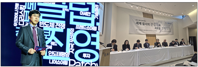 전문가 토론에서도 논의가 이어졌습니다. "한국이 갖고 있는 자원을 어떻게 결집하느냐가 전략적으로 중요하다", "클럽 간 경계가 두터운 첨단산업, 기술특허 영역에서 연결 국가로서 한국의 역량은 어느 정도 일까", "역내 국가와 경쟁하기보다는 협력해서 같이 공동 이익을 위해 만들어 나갈 것이 무엇인가"를 고민해야 한다는 견해가 나왔습니다. 특히 산업계가 인공지능으로 대전환을 맞고 있는 지금, 기업이 좀 더 적극적인 기회를 모색할 수 있게 정부가 불필요한 규제를 해소하는 역할에 나서야 한다는 목소리도 있었습니다.