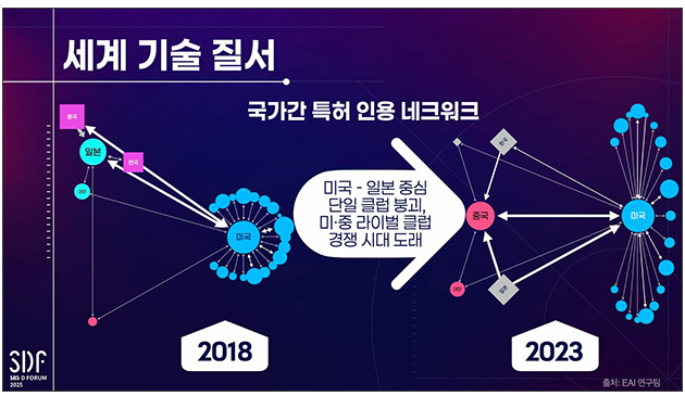 세계 기술 질서에서도 커다란 변화의 흐름이 감지됩니다. 2018년 ‘국가 간 특허 인용 네트워크’를 보면, 미국과 일본이 기술 클럽의 확실한 중심축이었지만 5년 뒤에는 중국이 일본을 대체하는 중심축으로 떠올랐습니다. 한국과 일본이 중국 중심의 클럽에서 이탈하는 움직임이 있었고, 규모 면에서는 중국 중심 클럽이 미국 중심의 클럽에 비해 현저히 작은 게 나타납니다. 연구팀은 네트워크가 줄어든 게 중국의 약점이지만 역으로 중국의 기술 자립을 촉진하는 원인이 됐다고 봤습니다.
